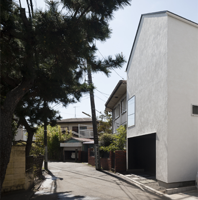最大間口約7m、奥行き約19mの細長い敷地に、さらに細長い建物を折り曲げて配置。空間の曲折が、奥行きを強調しつつ分節する。同時に、外側にできる余白を庭とした。 1階から2階へ、仕上げの質感や明るさも段階的に変化する住宅。(日経アーキテクチャー本文より抜粋)